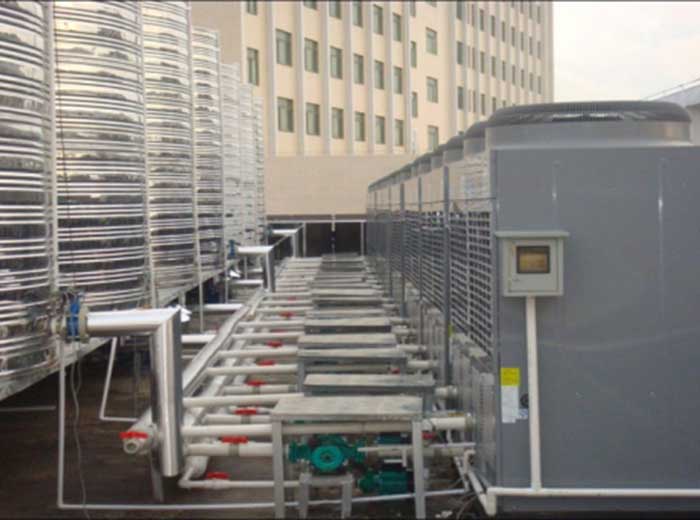 宿舍樓頂為平屋頂時一般把太陽能與空氣源熱泵放置樓頂,采用太陽能與空氣能輔助加熱方式,在光照充足的情況下,只利用太陽能就可以把水加熱,在太陽能不足或陰雨天氣的情況下,使用空氣能進行輔助加熱。兩種能源相結(jié)合,環(huán)保、節(jié)能,全天候、全自動、低能耗、365天運行。